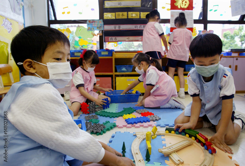 Kindergarten Students Wearing Masks To Ward Off Sars Play In Hong