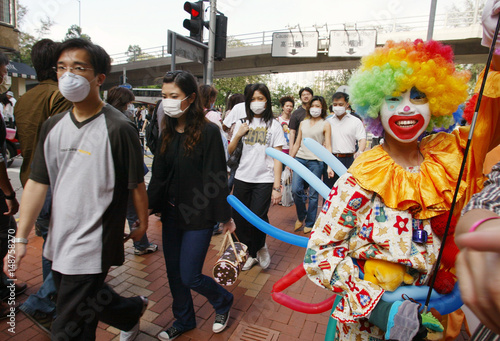 Clown Entertains Passers By Wearing Masks Against Sars In Hong Kong