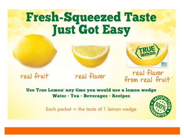 True lemon packets capture an entire wedge of fresh citrus fruit lemon lime grapefruit or orange through the power of flash freezing and crystallization.